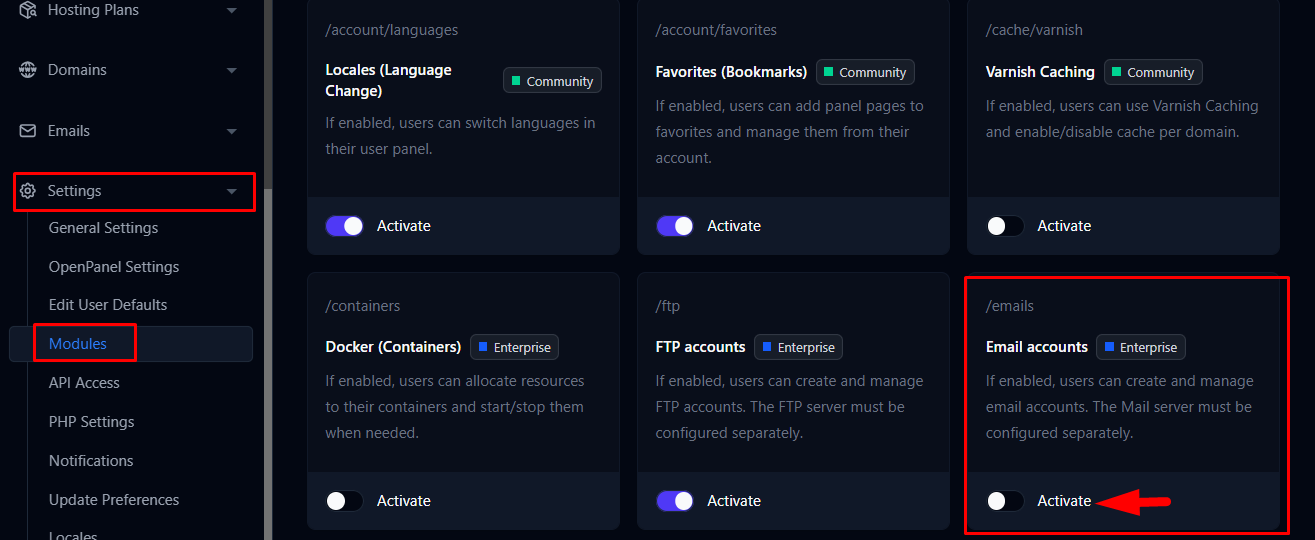 Antes de poder crear cuentas de correo, es necesario activar el módulo de Email desde el perfil de administrador.