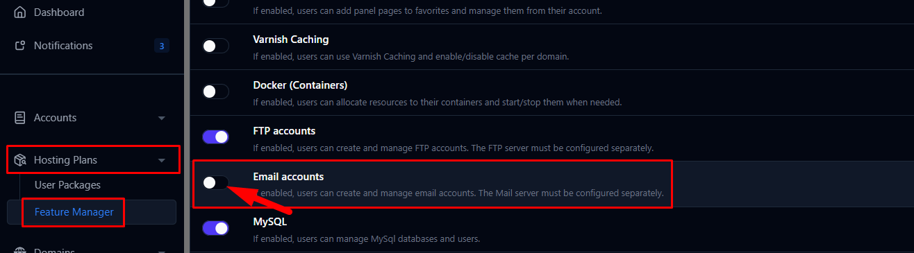 Hosting Plans→Feature Manager. - Localiza la línea Email accounts.
