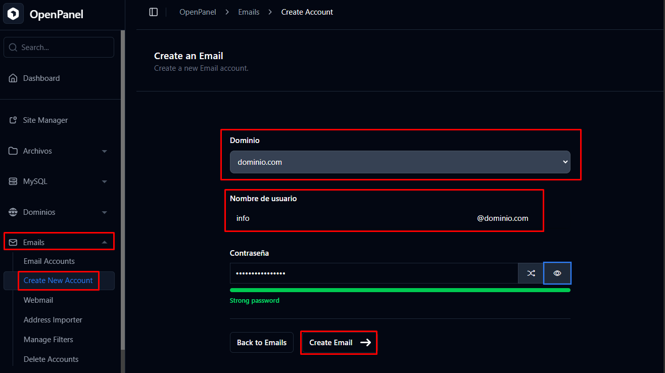 Create Email Account. - Selecciona el dominio disponible en la lista desplegable.
