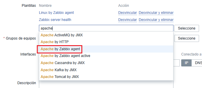 En la nueva ventana, seleccionamos Apache by Zabbix agent en el campo de Plantillas y actualizamos el Equipo:
