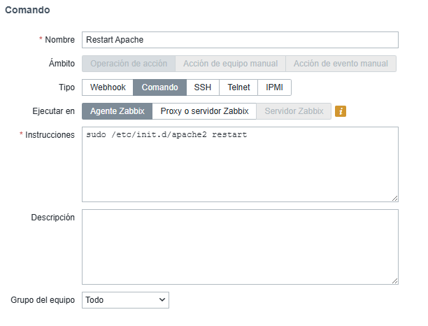 Con esta configuración, Zabbix reiniciará automáticamente Apache en tu servidor en caso de fallo, asegurando la continuidad del servicio sin intervención manual: