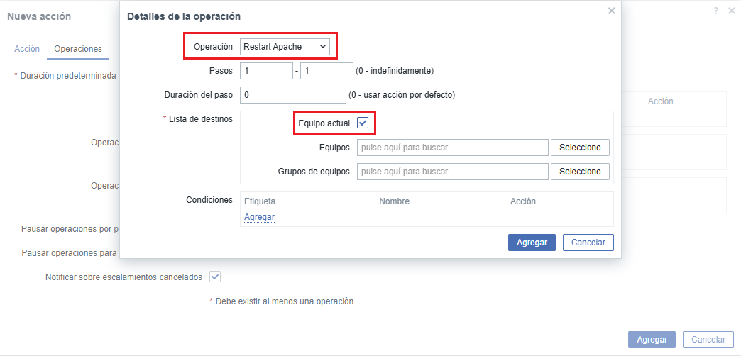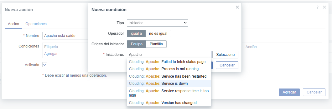 En Condiciones, hacemos clic en Agregar y añadimos la condición seleccionando en Iniciadores Apache: Service is down: