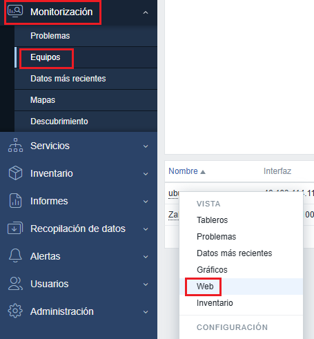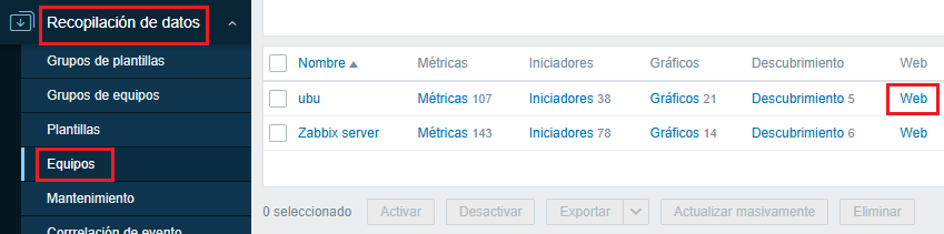 Accedemos al panel de Zabbix y vamos a Recopilación de datos y Equipos y clicamos en Web en el host donde queremos configurar la monitorización: