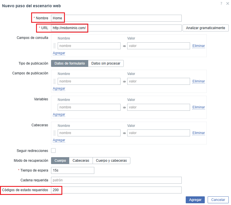 Códigos de estado requeridos corresponde al código HTTP que devuelve el servidor web en la cabecera de la respuesta. Lo habitual es usar el código 200, que significa que la solicitud se ha procesado correctamente. Si tu aplicación responde con otros códigos válidos (por ejemplo 301 para redirecciones), también puedes indicarlos aquí.