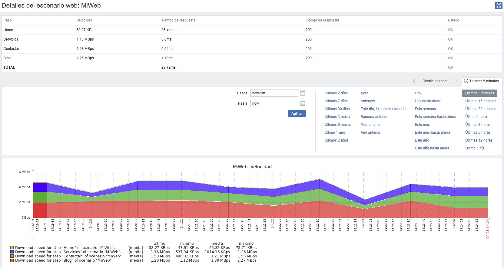 Seleccionamos el escenario que hemos creado y Zabbix nos mostrará métricas como tiempos de carga, estado de cada paso, contenido detectado y gráficas históricas: