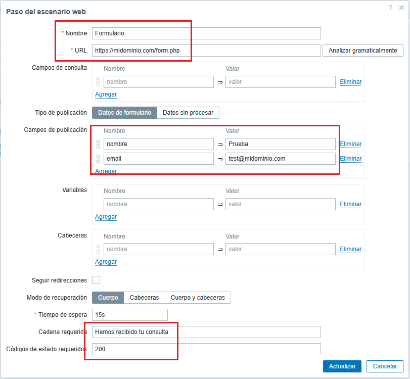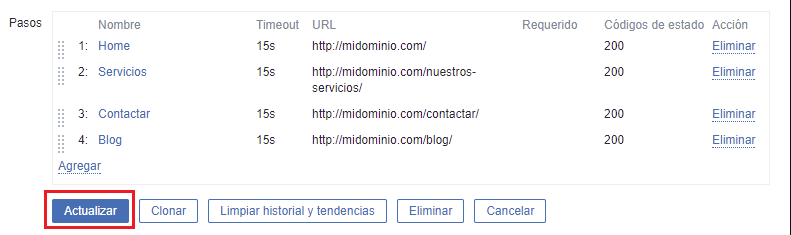 Cada vez que agregues o edites un nuevo paso en el escenario, recuerda pulsar el botón Actualizar para que los cambios se guarden correctamente. De lo contrario, Zabbix no tendrá en cuenta el paso en las próximas ejecuciones del escenario.
