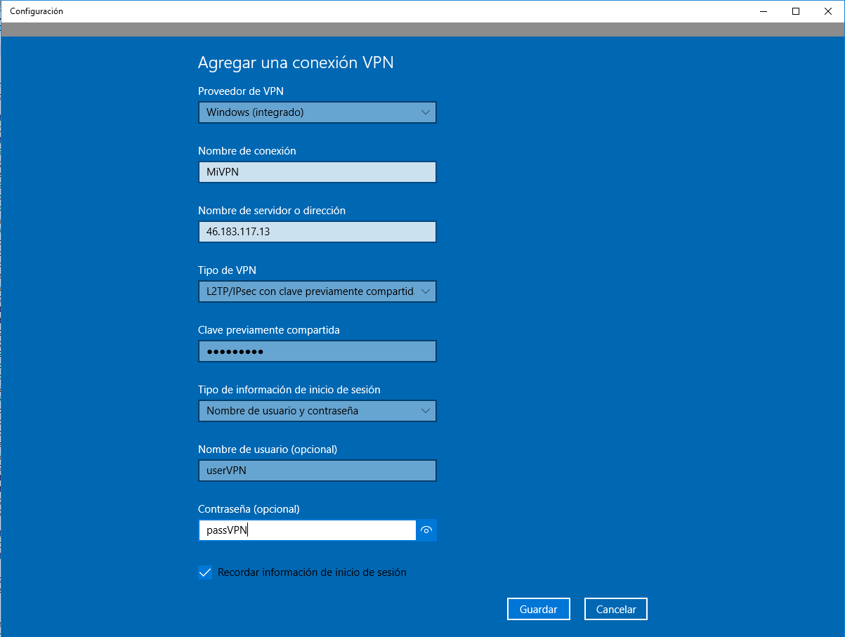En el panel de control de Windows en el buscador escribiremos VPN y entraremos en “Cambiar redes privadas virtuales” y pulsaremos en “Agregar una conexión VPN” y rellenaremos los campos con nuestros datos (IP, PSK, usuario y contraseña)