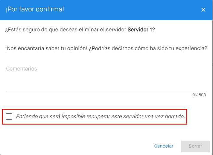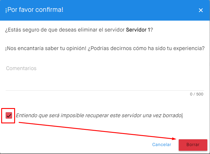 Te mostrará un modal con un aviso previo para que te asegures de que realmente deseas borrar ese servidor, aquí además podrás añadir un comentario sobre el motivo por el cual quieres eliminar el servidor.